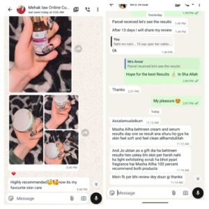 Bat ki jaya en ky products ki wo zaberdasts hain en ki en ki color white beauty cream ho ya ya serum sab mashallah boht achy hain ma 2nd time order kar rahi ma en ky all products sy 💯 persent satisfied ho
